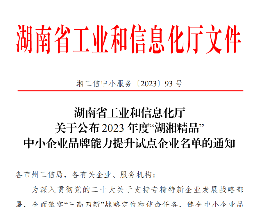 2023年3月14日,湖南省工业和信息化厅关于发布2023年度“湖湘精品”中小企业品牌能力提升试点企业名单的通知,经企业自主申报,市州工信局推荐,省工信厅审核,福尔程环保荣幸入选。