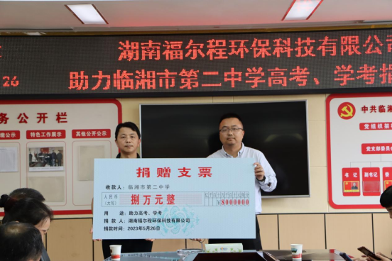 一年一度的中考、高考即拉开帷幕。5月26日,湖南福尔程环保科技有限公司来到临湘市第二中学为助力临湘市学生的高考、学考捐赠人民币捌万元整。捐赠仪式上,福尔程领导表示“能为学生们尽一份力量,献一份爱心是我们的责任和义务,更是我们的荣幸。”